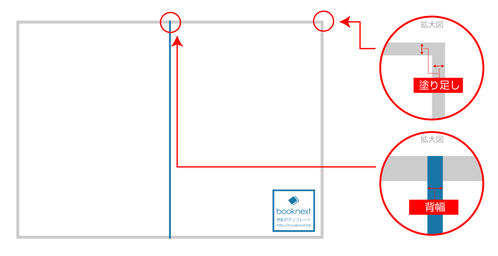 ダウンロードしたテンプレートは下記のような形で生成されます。外枠のグレーの部分が塗り足しの箇所、真ん中の青い線は背幅面となります。このテンプレートを目安にして表紙データをこのテンプレートに貼り付けて、塗り足し箇所と背幅箇所の目安にしてください。